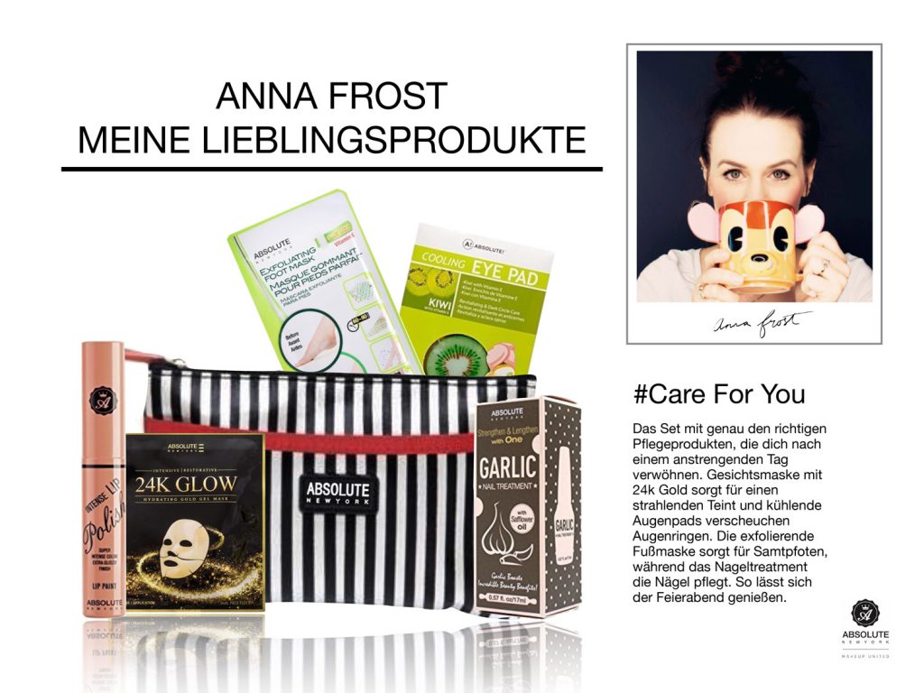 Anna Frost startete vor fast 10 Jahren mit ihrem ersten Blog. Über die Jahre hat sie ihr untrügliches Gespür für Trends gerade im Bereich Beauty immer wieder unter Beweis gestellt. 2014 wurde sie von der GfK zur einflussreichsten Fashion Bloggerin Deutschlands gekürt. Aktuell zeigt Anna Frost auf Ihrem Blog fafine.de die Must-haves. Dazu gehören auch die 3 Sets von ABSOLUTE NEW YORK, die sie für den Start zusammengestellt hat:
