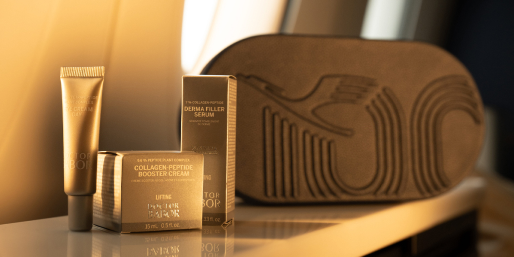 Das In-flight Skincare-Menü umfasst Produkte aus der DOCTOR BABOR Hochleistungspflege-Serie: eine intensiv feuchtigkeitsspendende Gel-Creme, Eye-Zone-Patches, ein hochwirksames Filler-Serum, eine Augencreme und einen Lippenbalsam. So wird Skincare an Bord zu einem ganz persönlichen Erlebnis – abgestimmt auf das, was die Haut in trockener Kabinenluft und nach einem langen Reisetag wirklich braucht.