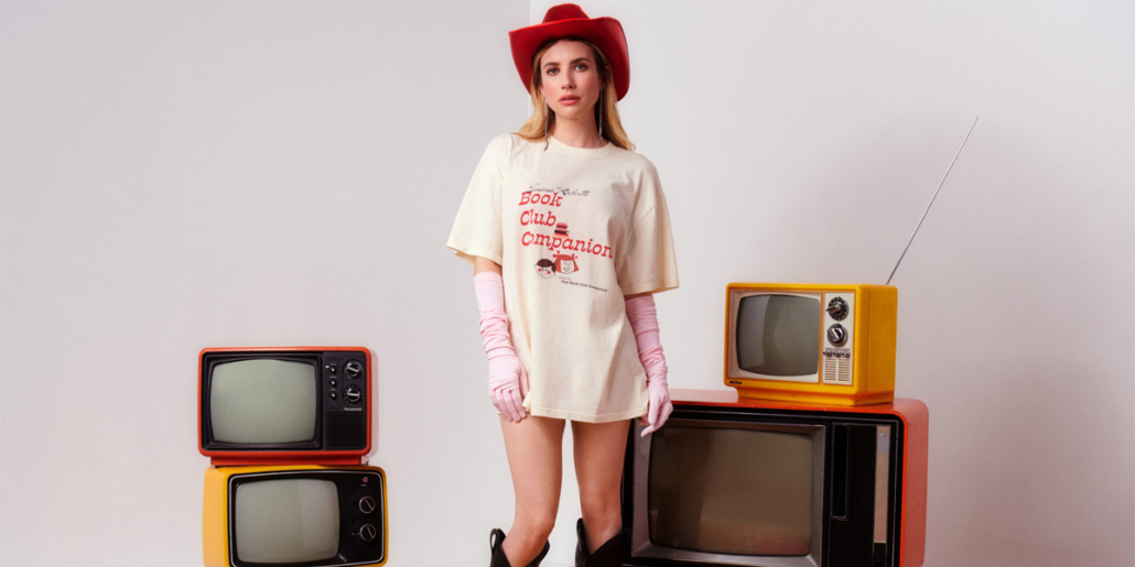 Als echter Bücherwurm liebt die Schauspielerin den Fashion Trend ‘Academia Aesthetics’, der an Ivy-League Bibliotheken und Prep School-Uniformen erinnert. Dieser findet sich auch in ihrer Kollektion wieder: Strickwesten und -polos, College T-Shirts und Sweatshirts, sowie Book Club-Prints und Statement-Krägen schaffen smarte Retro-Looks. Insgesamt zeichnet sich die Kollektion durch natürliche Stoffe wie Baumwolle, Lyocell und Leinen aus, die in fröhlichen Farben wie Rosa, Jeansblau und Rot erscheinen. Alle Pieces präsentieren den perfekten Mix aus feminin, cool und trotzdem verspielt. Denim und Karomuster mit Vintage-Waschung und Hufeisen-Print empfinden den lässigen Western Look nach, während weibliche Schnitte und süße Details wie Schleifen und Rüschen die Kollektion abrunden. Das Shooting mit dem Titel ‘Sugarland’ greift diese liebliche Komponente auf und verbildlicht Emmas Traumwelt. Fotograf Felix Cooper kreierte im Studio in LA ein zuckersüßes Wunderland, das Wildwest Elemente mit retro Suburban-Chic vereint. Erreicht wird das durch die Verwendung von Cowboy-Props wie Kakteen und Rodeo Elementen gemixt mit poppigen 50s Styling. Die interessante Kombination aus classy old-school Flair und einer Prise Cheekiness spiegelt Emmas Kollektion perfekt wider. Sie führt den Betrachter in ihre persönliche Fantasiewelt und lässt ihn überrascht und verzaubert zurück.