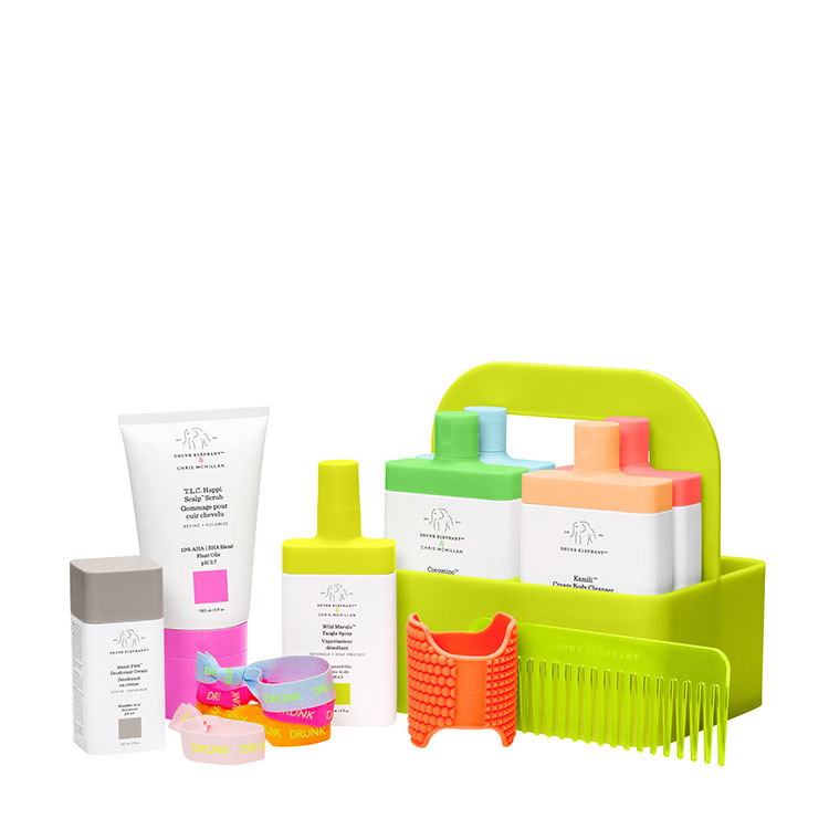 Das Set Hair + Body Trunk 1.0 enthält das komplette Haar- und Körpersortiment von DRUNK ELEPHANT in einem praktischen Duschbehälter. Von Shampoo auf Kokosnussbasis, Conditioner auf Pflanzenöl- und Butterbasis über das T.L.C. Happi Scalp Scrub für die Kopfhaut bis zum pflegenden Wild Marula Tangle Spray für besser kämmbares und geglättetes Haar ist für die tägliche Haarpflege alles dabei – inklusive Haargummi-Set und Neon-Acrylkamm fürs Styling. Der ultra-milde Kamili Cream Body Cleanser und die Sili Body Lotion mit feuchtigkeitsspendender Powerformel pflegen den Körper. Die Sweet Pitti Deodorant Cream sorgt für ein natürliches Frischegefühl und langanhaltenden Schutz über den ganzen Tag hinweg, während sich mit der zusätzlichen Silikon-Trockenbürste die Haut wohltuend massieren lässt.