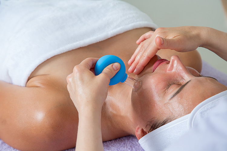Als nächstes werden die Schröpfgläser unter herausdrücken der Luft auf die Gesichtshaut gesetzt, wo sich diese durch den entstehenden Unterdruck festsaugen. Nun fasst man das Glas und gleitet damit vorsichtig über das Gesicht, entweder in streichenden oder in kreisenden Bewegungen. Jede Bewegung wird mehrfach ausgeführt, bis der zu behandelnde Bereich leicht gerötet und somit gut durchblutet ist. Besondere Vorsicht ist im Augenbereich geboten, da hier die Haut sehr dünn und empfindlich ist. Hier sollten sehr kleine Cups, mit einem Durchmesser von etwa 1 – 1,5 cm, verwendet und möglich wenig Druck ausgeübt werden.