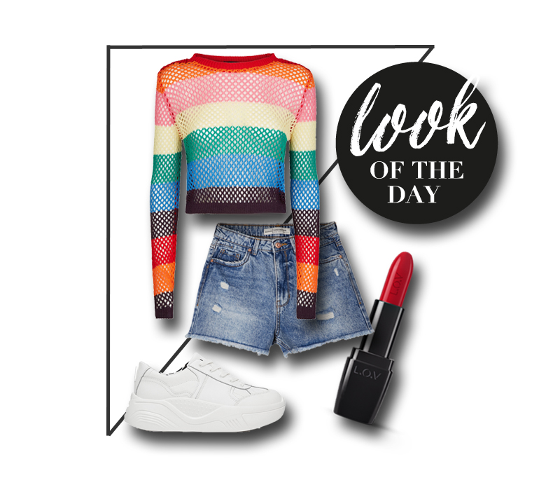 Shirt von New Look, ca. 30 Euro | Shorts von Stradivarius, ca. 20 Euro | Sneaker von ZARA, ca. 50 Euro | Lipstick von L.O.V