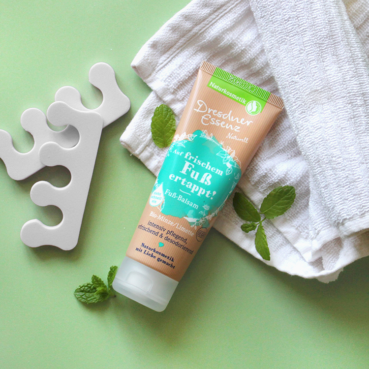 Nach dem Peeling ist es wichtig, deine Füße ausreichend mit Feuchtigkeit zu versorgen. Wähle eine reichhaltige Textur wie den Fuß-Balsam „Auf frischem Fuß ertappt!“ und massiere ihn in die Haut ein. Die Komposition mit ätherischem Bio-Minz- und Limettenöl erfrischt müde Füße und schwere Beine. Außerdem zieht der Fußbalsam schnell ein und pflegt dabei langanhaltend. Die desodorierende Wirkformel sorgt für rundum frische und streichelzart gepflegte Füße.