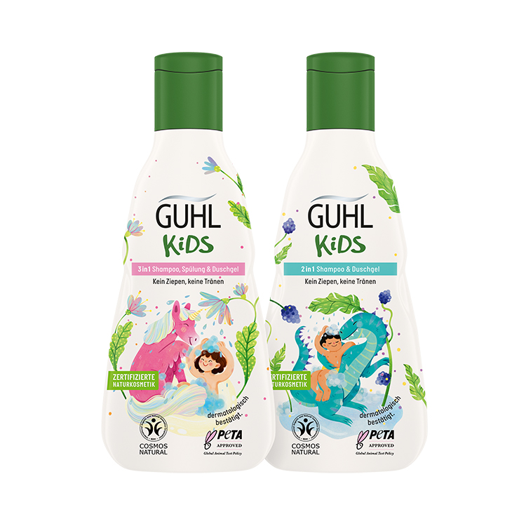 Die neue Linie Guhl Kids umfasst ein 3in1 Shampoo, Spülung und Duschgel sowie ein 2in1 Shampoo & Duschgel. Beide Produkte zeichnen sich durch sanfte, natürliche Inhaltsstoffe und eine vielseitige Anwendbarkeit aus. Besonderer Wert wird dabei auf Nachhaltigkeit und hautverträgliche Formulierungen gelegt: Die Guhl Kids Produkte sind COSMOS NATURAL zertifiziert, pH-hautneutral und verzichten vollständig auf Silikone, Mineralöle und synthetische Duftstoffe. Zudem ist die Produktreihe tierversuchsfrei und vegan.