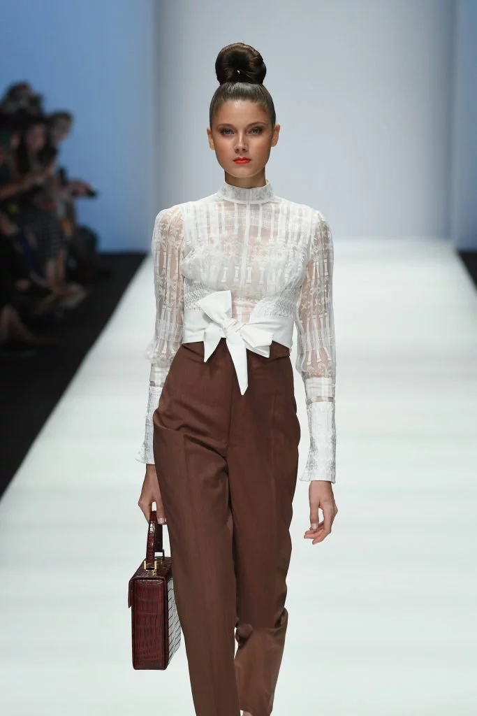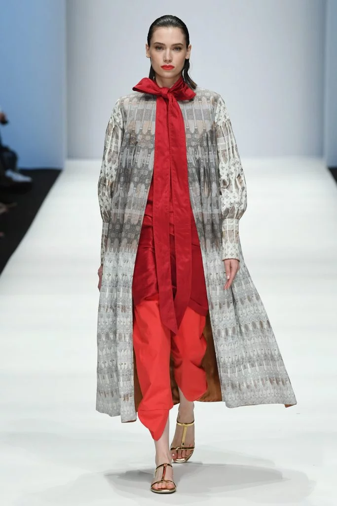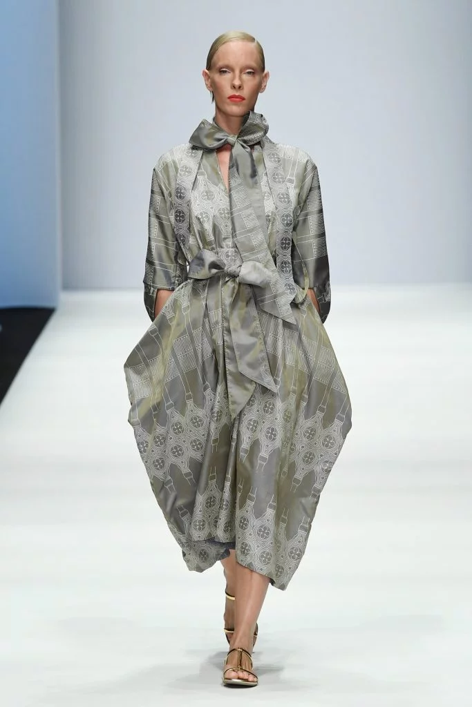 …- es entstehen Röcke mit ausgestellter Volumina, hochgeschnittene Kürbishosen, Corsagen, goldabgesteppten Jacken mit Puffärmeln, langen, schmalen Manschetten, hochgeschlossenen Stehkrägen und einer vorne tief sitzenden Taille, die nach hinten hin in einen hohen Rücken mündet. Überraschende Effekte im Innenleben der Kleidungsstücke bieten bedruckte Futterstoffe – als Verweis auf die auch heute noch prunkvollen Säle der Palazzi und Kirche.