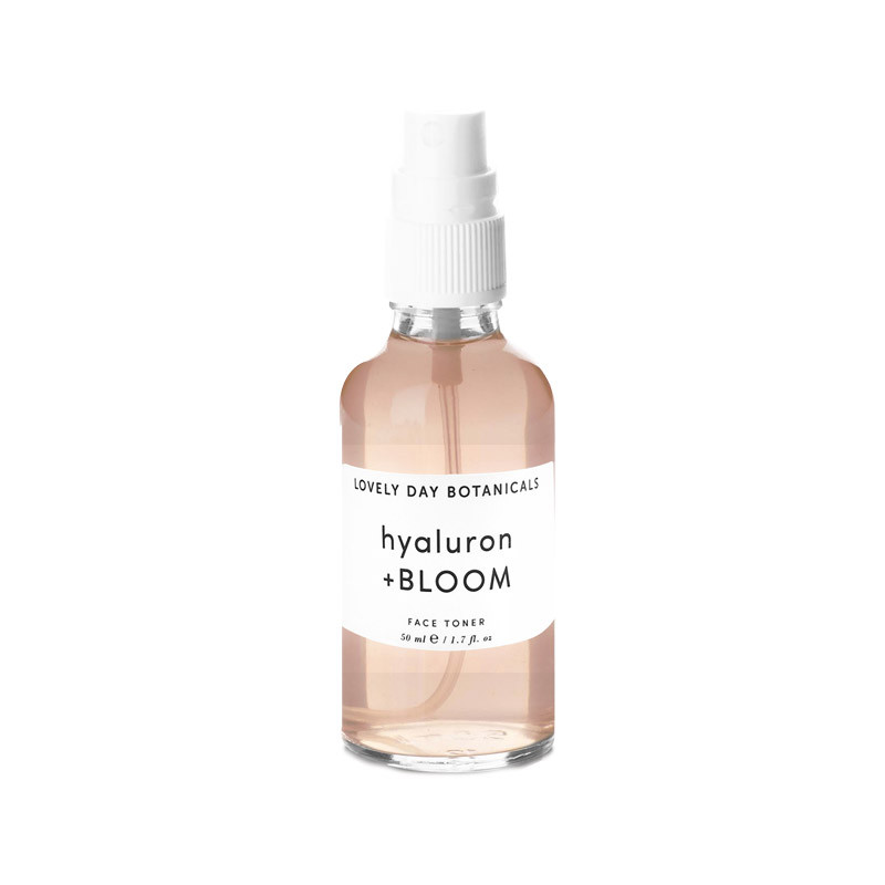 - ©Lovely Day Botanicals hyaluron + BLOOM Face Toner klärt Deine Haut nach der Reinigung – völlig ohne Alkohol – dafür mit mild adstringierendem, allergenfreiem Rosenblütenwasser, Aloe Vera und Kamille. Ca. 18 Euro über lovelydaybotanicals.com
