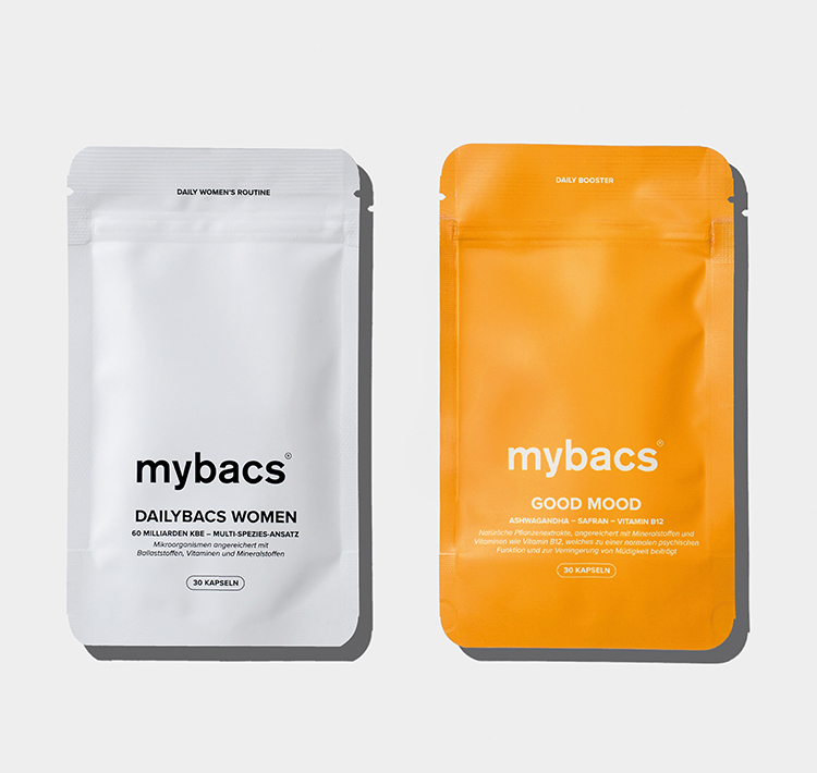 Über die Darm-Hirn-Achse kommunizieren die Darmbakterien über Nervenbahnen, Hormone und Stoffwechselprodukte mit dem Gehirn. Wenn es also dem Darm gut geht, sendet er positive Signale aus, die sich nachhaltig auf die Psyche und das Wohlbefinden auswirken. Darm und Hirn beeinflussen sich also gegenseitig. Um dieses Wechselspiel zu unterstützen, kombiniert das mybacs® Gut & Mood Duo die Dailybacs® als Basis mit dem Booster Good Mood. Der große Vorteil?