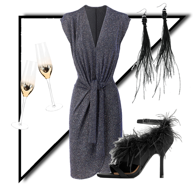 Kleid mit Metallic-Garn von © Mango, ca. 36 € | Sandaletten mit Federn von © ZARA, Preis auf Anfrage (derzeit nicht verfügbar) | Ohrringe von © Bijou Brigitte, ca. 15 € (derzeit nicht verfügbar) | Sektflöten von © MAISONS DU MONDE FRANCE, 6-er Set ca. 42 € (derzeit nicht verfügbar)