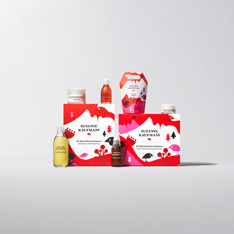 Das Label aus Österreich stimmt mit der liebevoll illustrierten Geschenk-Kollektion 2025 auf die Winter- und Weihnachtszeit ein. Die kuratierten Sets sind tief verbunden mit der ganzheitlichen Philosophie von Susanne Kaufmann und der Natur der Alpen: THE HYDRATE & GLOW COLLECTION – Bei diesem Gesichtspflege-Set stehen Verjüngung und Feuchtigkeitsversorgung im Mittelpunkt, um den Teint täglich mit einem geschmeidigen Glow zu krönen. Das Hyaluron Serum kombiniert hoch- und niedermolekulare Hyaluronsäure und wird ergänzt von der Nourishing Day Cream, die u.a. mit Alpenrosenextrakt feine Linien sichtbar mindert und die Haut in den kalten Wintermonaten pflegt und beruhigt. THE ALPINE RETREAT COLLECTION – Das köstlich nach alpinen Aromen duftende Körperpflegeduo kommt in praktischen Travelsizes daher. Es enthält ein Schaumbad mit einem stimmungsaufhellenden Mix ätherischer Öle aus Rosmarin, Salbei und Zedernholz. Die ergänzende Body Butter verwöhnt mit Olivenöl, Molke und Sheabutter, spendet intensiv Feuchtigkeit und regeneriert selbst trockene Haut. Preis: ab 48 Euro über organicluxury.de.