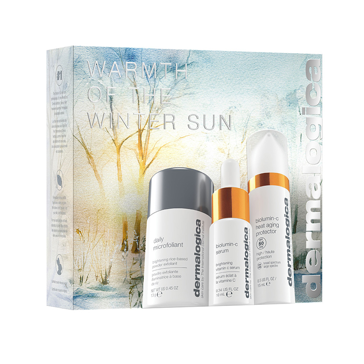 Warmth of the winter sun ist ein Set, das die Haut schützt und zum Strahlen bringt – inspiriert von der wärmenden Kraft der Wintersonne. Es beinhaltet den Daily Microfoliant, Travel Size 13g: Sanftes Peeling für strahlende Haut, das BioLumin-C Serum, Travel Size 10ml: Hochwirksames Vitamin C für sichtbare Leuchtkraft sowie den BioLumin-C Heat Aging Protector SPF 50, Travel Size 15ml: Sonnenschutz mit innovativem Hitzeschutz. Preis: 78 Euro über dermalogica.com.