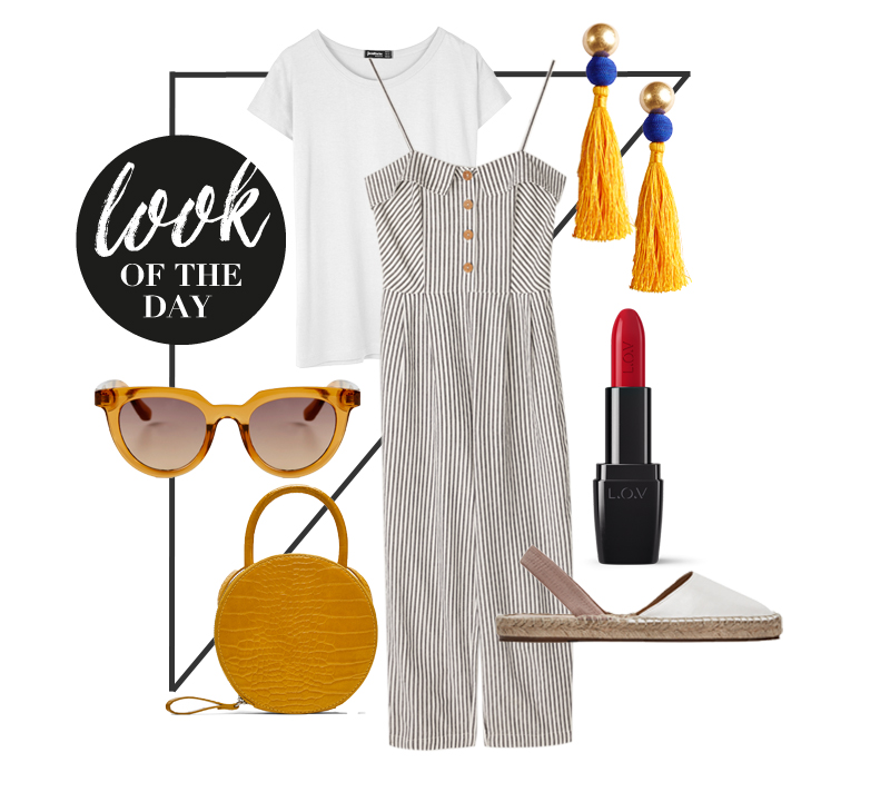 Jumpsuit von Stradivarius, ca. 40 Euro | T-Shirt von Stradivarius, ca. 6 Euro | Brille von MANGO, ca. 20 Euro | Tasche von ZARA, ca. 40 Euro | Ohrringe von MANGO, Preis auf Anfrage | LIPaffair Color & Care Lipstick No. 551 von L.O.V, ca. 10 Euro | Schuhe von ZARA, ca. 20 Euro