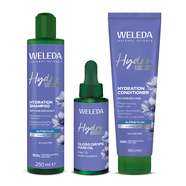 Wenn Innovation die Sprache der Natur spricht, entsteht etwas Zeitloses. Hydra Shine verbindet die Reinheit alpiner Pflanzen mit moderner Pflegekompetenz – eine Routine, die trockenem, glanzlosem oder strapaziertem Haar neue Vitalität schenkt. Frizz wird gezähmt, die Struktur wird gestärkt, das Haar wirkt geschmeidig und lebendig – ganz ohne Silikone. Herzstück der Linie ist die Leinpflanze aus den Schweizer Alpen. Seine Flavonoide beruhigen die Kopfhaut und fördern geschmeidiges Haar, während nährende Pflanzenöle wie Argan-, Jojoba-, Kokos- und Borretschöl zusammen mit Hyaluronsäure intensiv pflegen und neue Elastizität schenken. Die neue Haarpflegelinie besteht aus dem Hydra Shine Hydration Shampoo, Hydra Shine Hydration Conditioner und dem Hydra Shine Gloss Drops Haar-Öl. Preis: ab 6,95 Euro über weleda.de.
