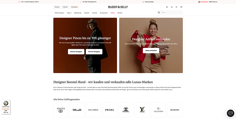 Buddy & Selly ist eine Plattform für alle, die Luxusmode bewusst konsumieren möchten. Im Fokus steht der Weiterverkauf und Erwerb von hochwertiger Designer-Second-Hand – eine nachhaltige Alternative zur Fast Fashion. Modeinteressierte können dort gebrauchte Luxusartikel wie Taschen, Kleidung oder Schuhe verkaufen oder erwerben – einfach, transparent und ohne großen Aufwand. Wer Designerstücke nicht mehr trägt, kann sie kostenlos einsenden. Nach einer Qualitäts- und Marktwertprüfung erhalten Verkäufer ein faires Angebot. Wird dieses akzeptiert, erfolgt die Auszahlung schnell und direkt. Wird das Angebot abgelehnt, gehen die Artikel kostenfrei zurück. Auch Käufer profitieren: Im Online-Shop von Buddy & Selly finden sich sorgfältig geprüfte, authentische Designerteile zu erschwinglichen Preisen. Das Sortiment reicht von Klassikern bis hin zu aktuellen Trends und umfasst Marken wie Gucci, Prada oder Balenciaga.
